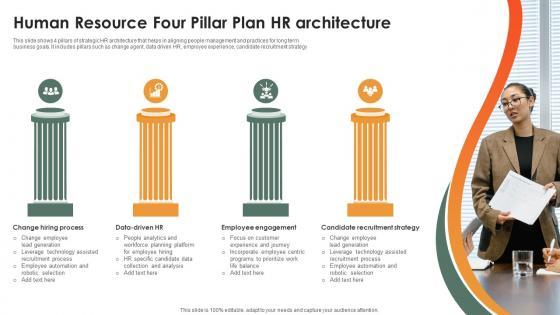 This slide shows 4 pillars of strategic HR architecture that helps in aligning people management and practices for long term business goals. It includes pillars such as change agent, data driven HR, employee experience, candidate recruitment strategy. Pitch your topic with ease and precision using this Human Resource Four Pillar Plan HR Architecture Template Pdf. This layout presents information on Data Driven HR, Employee Experience, Candidate Recruitment Strategy. It is also available for immediate download and adjustment. So, changes can be made in the color, design, graphics or any other component to create a unique layout.