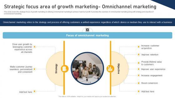 This slide covers the strategic focus of growth marketing on utilizing omnichannel marketing to achieve maximum profit. It provides the overview of omnichannel marketing along with strategy and objective of omnichannel marketing. Slidegeeks is here to make your presentations a breeze with A Comprehensive Approach To Growth Strategic Focus Area Of Growth Marketing MKT SS V With our easy-to-use and customizable templates, you can focus on delivering your ideas rather than worrying about formatting. With a variety of designs to choose from, you are sure to find one that suits your needs. And with animations and unique photos, illustrations, and fonts, you can make your presentation pop. So whether you are giving a sales pitch or presenting to the board, make sure to check out Slidegeeks first