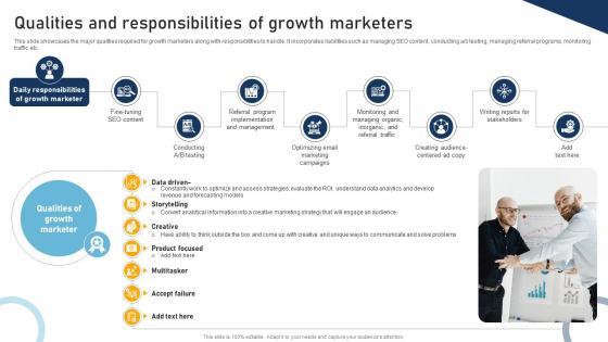 This slide showcases the major qualities required for growth marketers along with responsibilities to handle. It incorporates liabilities such as managing SEO content, conducting a or b testing, managing referral programs, monitoring traffic etc. Formulating a presentation can take up a lot of effort and time, so the content and message should always be the primary focus. The visuals of the PowerPoint can enhance the presenters message, so our A Comprehensive Approach To Qualities And Responsibilities Of Growth Marketers MKT SS V was created to help save time. Instead of worrying about the design, the presenter can concentrate on the message while our designers work on creating the ideal templates for whatever situation is needed. Slidegeeks has experts for everything from amazing designs to valuable content, we have put everything into A Comprehensive Approach To Qualities And Responsibilities Of Growth Marketers MKT SS V.