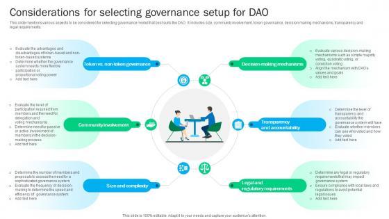 This slide mentions various aspects to be considered for selecting governance model that best suits the DAO. It includes size, community involvement, token governance, decision making mechanisms, transparency and legal requirements. Get a simple yet stunning designed Blockchain Basics Understanding Considerations For Selecting Ppt Sample BCT SS V. It is the best one to establish the tone in your meetings. It is an excellent way to make your presentations highly effective. So, download this PPT today from Slidegeeks and see the positive impacts. Our easy-to-edit Blockchain Basics Understanding Considerations For Selecting Ppt Sample BCT SS V can be your go-to option for all upcoming conferences and meetings. So, what are you waiting for Grab this template today.