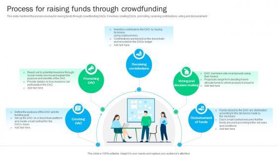 This slide mentions the process involved in raising funds through crowdfunding DAOs. It involves creating DAOs, promoting, receiving contributions, voting and disbursement. Boost your pitch with our creative Blockchain Basics Understanding Process For Raising Funds Through Ppt Presentation BCT SS V. Deliver an awe-inspiring pitch that will mesmerize everyone. Using these presentation templates you will surely catch everyones attention. You can browse the ppts collection on our website. We have researchers who are experts at creating the right content for the templates. So you do not have to invest time in any additional work. Just grab the template now and use them.