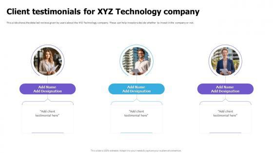This slide shows the detailed reviews given by users about the XYZ Technology company. These can help investors decide whether to invest in the company or not. Boost your pitch with our creative Client Testimonials For XYZ Technology Company Cloud Game Development Fundraising Pitch Deck. Deliver an awe-inspiring pitch that will mesmerize everyone. Using these presentation templates you will surely catch everyones attention. You can browse the ppts collection on our website. We have researchers who are experts at creating the right content for the templates. So you do not have to invest time in any additional work. Just grab the template now and use them.