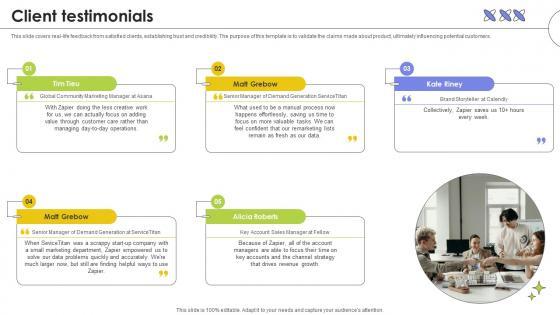 This slide covers real-life feedback from satisfied clients, establishing trust and credibility. The purpose of this template is to validate the claims made about product, ultimately influencing potential customers. Create an editable Client Testimonials Web Based Automated Tool Platform Pitch Deck Ppt Example that communicates your idea and engages your audience. Whether you are presenting a business or an educational presentation, pre-designed presentation templates help save time. Client Testimonials Web Based Automated Tool Platform Pitch Deck Ppt Example is highly customizable and very easy to edit, covering many different styles from creative to business presentations. Slidegeeks has creative team members who have crafted amazing templates. So, go and get them without any delay.