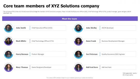 The purpose of this slide is to introduce and acknowledge the members of XYZ Solutions company. These include Chief Executive Officer CEO, Chief Technology Officer CTO, product manager, game designer, AR or VR developer, etc. Want to ace your presentation in front of a live audience Our Core Team Members Of XYZ Solutions Company Cloud Game Development Fundraising Pitch Deck can help you do that by engaging all the users towards you. Slidegeeks experts have put their efforts and expertise into creating these impeccable powerpoint presentations so that you can communicate your ideas clearly. Moreover, all the templates are customizable, and easy-to-edit and downloadable. Use these for both personal and commercial use.