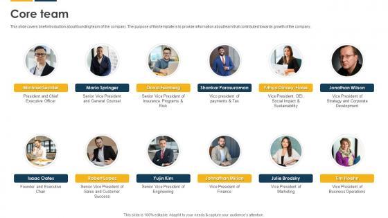 This slide covers brief introduction about founding team of the company. The purpose of this template is to provide information about team that contributed towards growth of the company. There are so many reasons you need a Core Team Payroll Solutions Provider Investor Funding Elevator Pitch Deck. The first reason is you can not spend time making everything from scratch, Thus, Slidegeeks has made presentation templates for you too. You can easily download these templates from our website easily.