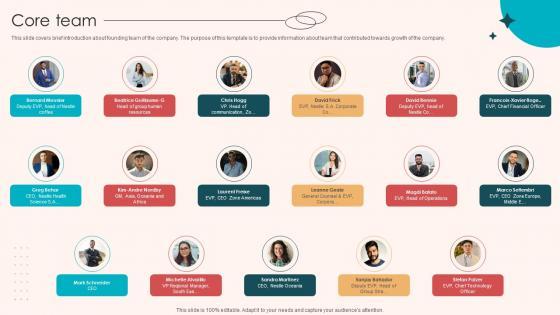 This slide covers brief introduction about founding team of the company. The purpose of this template is to provide information about team that contributed towards growth of the company. Do you have to make sure that everyone on your team knows about any specific topic I yes, then you should give Core Team Retail Merchandising Company Investor Funding Elevator Pitch Deck Ppt Example a try. Our experts have put a lot of knowledge and effort into creating this impeccable Core Team Retail Merchandising Company Investor Funding Elevator Pitch Deck Ppt Example. You can use this template for your upcoming presentations, as the slides are perfect to represent even the tiniest detail. You can download these templates from the Slidegeeks website and these are easy to edit. So grab these today