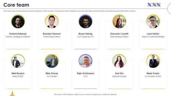 This slide covers brief introduction about founding team of the company. The purpose of this template is to provide information about team that contributed towards growth of the company. There are so many reasons you need a Core Team Web Based Automated Tool Platform Pitch Deck Ppt Example. The first reason is you can not spend time making everything from scratch, Thus, Slidegeeks has made presentation templates for you too. You can easily download these templates from our website easily.