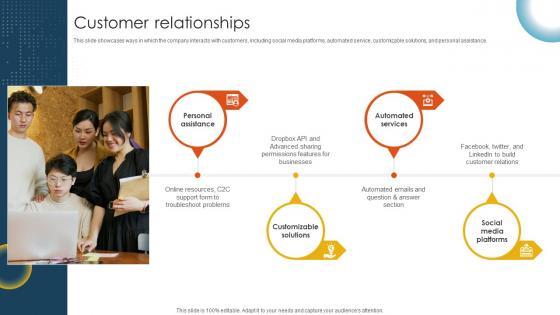 This slide showcases ways in which the company interacts with customers, including social media platforms, automated service, customizable solutions, and personal assistance. Slidegeeks is one of the best resources for PowerPoint templates. You can download easily and regulate Customer Relationships Cloud Storage And Collaboration Service Business Model BMC SS V for your personal presentations from our wonderful collection. A few clicks is all it takes to discover and get the most relevant and appropriate templates. Use our Templates to add a unique zing and appeal to your presentation and meetings. All the slides are easy to edit and you can use them even for advertisement purposes.