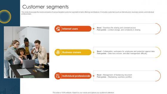 This slide showcases the needs and pains of various targeted customer segments to tailor offerings and features. It includes customers such as internet users, business owners, and individual professionals. Want to ace your presentation in front of a live audience Our Customer Segments Cloud Storage And Collaboration Service Business Model BMC SS V can help you do that by engaging all the users towards you. Slidegeeks experts have put their efforts and expertise into creating these impeccable powerpoint presentations so that you can communicate your ideas clearly. Moreover, all the templates are customizable, and easy-to-edit and downloadable. Use these for both personal and commercial use.