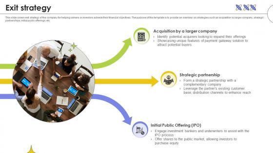 This slide covers exit strategy of the company for helping owners or investors achieve their financial objectives. The purpose of this template is to provide an overview on strategies such as acquisition by larger company, strategic partnerships, initial public offerings, etc. Get a simple yet stunning designed Exit Strategy Web Based Automated Tool Platform Pitch Deck Ppt Example. It is the best one to establish the tone in your meetings. It is an excellent way to make your presentations highly effective. So, download this PPT today from Slidegeeks and see the positive impacts. Our easy-to-edit Exit Strategy Web Based Automated Tool Platform Pitch Deck Ppt Example can be your go-to option for all upcoming conferences and meetings. So, what are you waiting for Grab this template today.