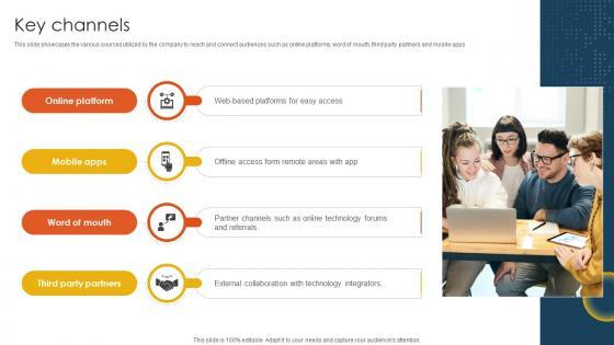 This slide showcases the various sources utilized by the company to reach and connect audiences such as official website, retail store and ecommerce shopping website. From laying roadmaps to briefing everything in detail, our templates are perfect for you. You can set the stage with your presentation slides. All you have to do is download these easy-to-edit and customizable templates. Key Channels Technology Solution Provider Business Model BMC SS V will help you deliver an outstanding performance that everyone would remember and praise you for. Do download this presentation today.