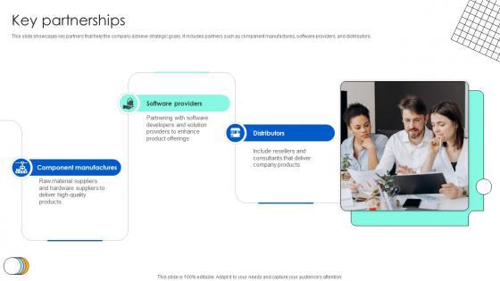 This slide showcases key partners that help the company achieve strategic goals. It includes partners such as component manufactures, software providers, and distributors. Present like a pro with Key Partnerships Technology Solution Provider Business Model BMC SS V. Create beautiful presentations together with your team, using our easy-to-use presentation slides. Share your ideas in real-time and make changes on the fly by downloading our templates. So whether you are in the office, on the go, or in a remote location, you can stay in sync with your team and present your ideas with confidence. With Slidegeeks presentation got a whole lot easier. Grab these presentations today.