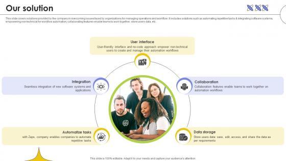 This slide covers solutions provided by the company in overcoming issues faced by organizations for managing operations and workflow. It includes solutions such as automating repetitive tasks and integrating software systems, empowering non technical for workflow automation, collaborating features enable teams to work together, store users data, etc. Crafting an eye-catching presentation has never been more straightforward. Let your presentation shine with this tasteful yet straightforward Our Solution Web Based Automated Tool Platform Pitch Deck Ppt Example template. It offers a minimalistic and classy look that is great for making a statement. The colors have been employed intelligently to add a bit of playfulness while still remaining professional. Construct the ideal Our Solution Web Based Automated Tool Platform Pitch Deck Ppt Example that effortlessly grabs the attention of your audience Begin now and be certain to wow your customers