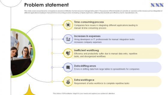 This slide covers issues faced by companies in absence of effective human resource management system. The purpose of this template is to provide an overview on the issues such as integration of different applications leading to manual and time consuming process, increasing company expenses, suffering of productivity and efficiency due to repeated task, etc. Make sure to capture your audiences attention in your business displays with our gratis customizable Problem Statement Web Based Automated Tool Platform Pitch Deck Ppt Powerpoint. These are great for business strategies, office conferences, capital raising or task suggestions. If you desire to acquire more customers for your tech business and ensure they stay satisfied, create your own sales presentation with these plain slides.