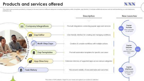 This slide covers products provided by company to its users based on different categories including integrations, editor, templates, app directory. It includes additional services such as bulk transferring, no code databases, interfaces, etc. Formulating a presentation can take up a lot of effort and time, so the content and message should always be the primary focus. The visuals of the PowerPoint can enhance the presenters message, so our Products And Services Offered Web Based Automated Tool Platform Pitch Deck Ppt Template was created to help save time. Instead of worrying about the design, the presenter can concentrate on the message while our designers work on creating the ideal templates for whatever situation is needed. Slidegeeks has experts for everything from amazing designs to valuable content, we have put everything into Products And Services Offered Web Based Automated Tool Platform Pitch Deck Ppt Template.