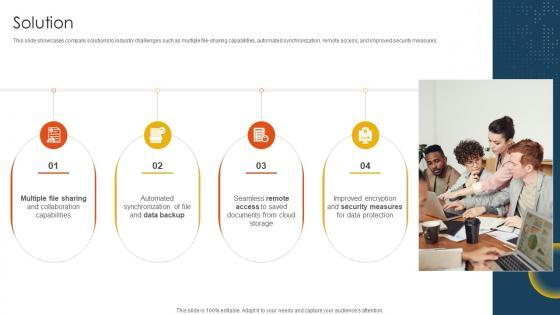 This slide showcases company solutions to industry challenges such as multiple file-sharing capabilities, automated synchronization, remote access, and improved security measures. If your project calls for a presentation, then Slidegeeks is your go-to partner because we have professionally designed, easy-to-edit templates that are perfect for any presentation. After downloading, you can easily edit Solution Cloud Storage And Collaboration Service Business Model BMC SS V and make the changes accordingly. You can rearrange slides or fill them with different images. Check out all the handy templates