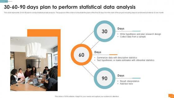 This slide represents 30-60-90 plan to conduct statistical data analysis. The purpose of this slide is to illustrate the plans of the first 90 days from the start of the project including steps to be followed at interval of one month. Do you have to make sure that everyone on your team knows about any specific topic I yes, then you should give Statistical Tools For Evidence 30 60 90 Days Plan To Perform Statistical Data Analysis a try. Our experts have put a lot of knowledge and effort into creating this impeccable Statistical Tools For Evidence 30 60 90 Days Plan To Perform Statistical Data Analysis. You can use this template for your upcoming presentations, as the slides are perfect to represent even the tiniest detail. You can download these templates from the Slidegeeks website and these are easy to edit. So grab these today
