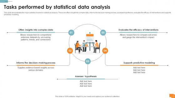 This slide demonstrates the major activities involved in statistical analysis. These are offers insight into complex data, informs the decision-making process, assesses hypotheses, evaluates the efficacy of interventions and supports predictive modeling. Get a simple yet stunning designed Statistical Tools For Evidence Tasks Performed By Statistical Data Analysis. It is the best one to establish the tone in your meetings. It is an excellent way to make your presentations highly effective. So, download this PPT today from Slidegeeks and see the positive impacts. Our easy-to-edit Statistical Tools For Evidence Tasks Performed By Statistical Data Analysis can be your go-to option for all upcoming conferences and meetings. So, what are you waiting for Grab this template today.