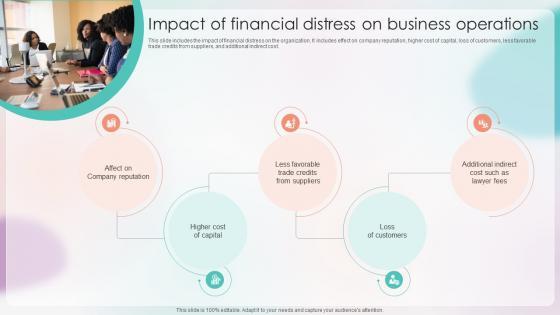 This slide includes the impact of financial distress on the organization. It includes effect on company reputation, higher cost of capital, loss of customers, less favorable trade credits from suppliers, and additional indirect cost. If your project calls for a presentation, then Slidegeeks is your go-to partner because we have professionally designed, easy-to-edit templates that are perfect for any presentation. After downloading, you can easily edit Strategies For Stabilizing Corporate Impact Of Financial Distress On Business Operations and make the changes accordingly. You can rearrange slides or fill them with different images. Check out all the handy templates