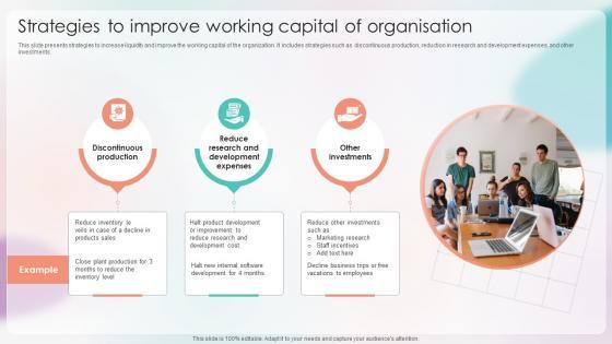 This slide presents strategies to increase liquidity and improve the working capital of the organization. It includes strategies such as discontinuous production, reduction in research and development expenses, and other investments. This Strategies For Stabilizing Corporate Strategies To Improve Working Capital Of Organisation from Slidegeeks makes it easy to present information on your topic with precision. It provides customization options, so you can make changes to the colors, design, graphics, or any other component to create a unique layout. It is also available for immediate download, so you can begin using it right away. Slidegeeks has done good research to ensure that you have everything you need to make your presentation stand out. Make a name out there for a brilliant performance.