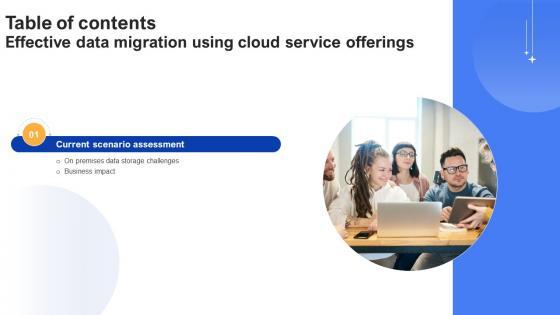 Whether you have daily or monthly meetings, a brilliant presentation is necessary. Table Of Contents For Effective Data Migration Using Cloud Service Offerings can be your best option for delivering a presentation. Represent everything in detail using Table Of Contents For Effective Data Migration Using Cloud Service Offerings and make yourself stand out in meetings. The template is versatile and follows a structure that will cater to your requirements. All the templates prepared by Slidegeeks are easy to download and edit. Our research experts have taken care of the corporate themes as well. So, give it a try and see the results.