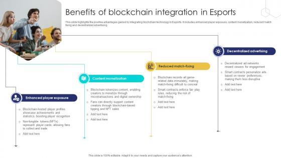 This slide highlights the positive advantages gained by integrating blockchain technology in Esports. It includes enhanced player exposure, content monetization, reduced match fixing and decentralized advertising. Do you have to make sure that everyone on your team knows about any specific topic I yes, then you should give Unlocking The Potential Of Benefits Of Blockchain Integration In Esports BCT SS V a try. Our experts have put a lot of knowledge and effort into creating this impeccable Unlocking The Potential Of Benefits Of Blockchain Integration In Esports BCT SS V. You can use this template for your upcoming presentations, as the slides are perfect to represent even the tiniest detail. You can download these templates from the Slidegeeks website and these are easy to edit. So grab these today