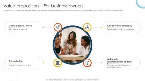 This slide exhibits a unique selling proposition offered by the company to business owners such as automatic synchronization of data, online backup service, risk reduction, and collaborative efficiency. Are you in need of a template that can accommodate all of your creative concepts This one is crafted professionally and can be altered to fit any style. Use it with Google Slides or PowerPoint. Include striking photographs, symbols, depictions, and other visuals. Fill, move around, or remove text boxes as desired. Test out color palettes and font mixtures. Edit and save your work, or work with colleagues. Download Value Proposition For Business Owners Cloud Storage And Collaboration Service Business Model BMC SS V and observe how to make your presentation outstanding. Give an impeccable presentation to your group and make your presentation unforgettable.