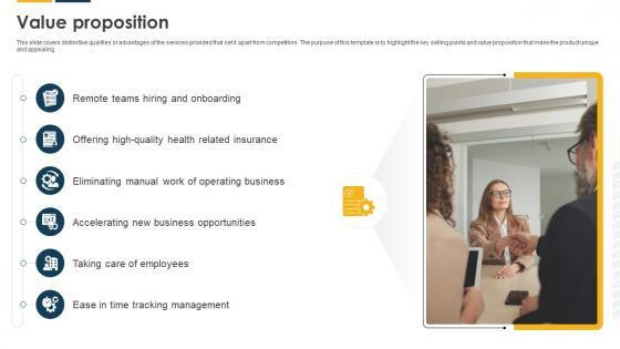 This slide covers distinctive qualities or advantages of the services provided that set it apart from competitors. The purpose of this template is to highlight the key selling points and value proposition that make the product unique and appealing. Explore a selection of the finest Value Proposition Payroll Solutions Provider Investor Funding Elevator Pitch Deck here. With a plethora of professionally designed and pre-made slide templates, you can quickly and easily find the right one for your upcoming presentation. You can use our Value Proposition Payroll Solutions Provider Investor Funding Elevator Pitch Deck to effectively convey your message to a wider audience. Slidegeeks has done a lot of research before preparing these presentation templates. The content can be personalized and the slides are highly editable. Grab templates today from Slidegeeks.