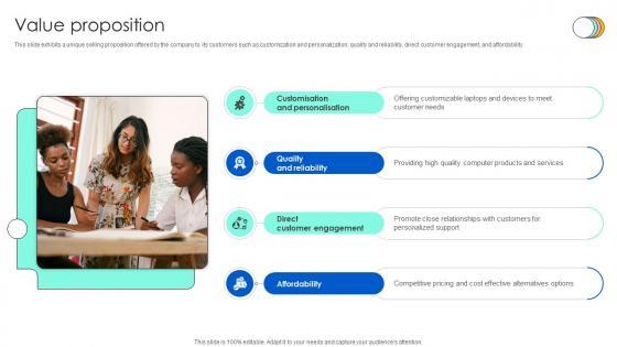 This slide exhibits a unique selling proposition offered by the company to its customers such as customization and personalization, quality and reliability, direct customer engagement, and affordability. Are you in need of a template that can accommodate all of your creative concepts This one is crafted professionally and can be altered to fit any style. Use it with Google Slides or PowerPoint. Include striking photographs, symbols, depictions, and other visuals. Fill, move around, or remove text boxes as desired. Test out color palettes and font mixtures. Edit and save your work, or work with colleagues. Download Value Proposition Technology Solution Provider Business Model BMC SS V and observe how to make your presentation outstanding. Give an impeccable presentation to your group and make your presentation unforgettable.