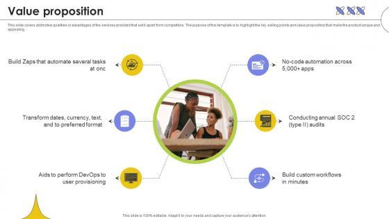 This slide covers distinctive qualities or advantages of the services provided that set it apart from competitors. The purpose of this template is to highlight the key selling points and value proposition that make the product unique and appealing. Welcome to our selection of the Value Proposition Web Based Automated Tool Platform Pitch Deck Ppt Template. These are designed to help you showcase your creativity and bring your sphere to life. Planning and Innovation are essential for any business that is just starting out. This collection contains the designs that you need for your everyday presentations. All of our PowerPoints are 100Percent editable, so you can customize them to suit your needs. This multi-purpose template can be used in various situations. Grab these presentation templates today.