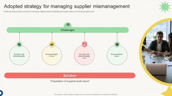 Mentioned slide provides overview for managing multiple business challenges with single solution of conducting supplier audit. Get a simple yet stunning designed Vendor Management Audit Adopted Strategy For Managing Supplier Mismanagement. It is the best one to establish the tone in your meetings. It is an excellent way to make your presentations highly effective. So, download this PPT today from Slidegeeks and see the positive impacts. Our easy-to-edit Vendor Management Audit Adopted Strategy For Managing Supplier Mismanagement can be your go-to option for all upcoming conferences and meetings. So, what are you waiting for Grab this template today.