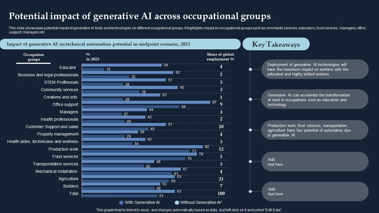 This slide showcases potential impact of generative AI tools and technologies on different occupational groups. It highlights impact on occupational groups such as community services, educators, food services, managers, office support, managers etc. Boost your pitch with our creative Potential Impact Of Generative AI Across Occupational Groups Download PDF. Deliver an awe-inspiring pitch that will mesmerize everyone. Using these presentation templates you will surely catch everyones attention. You can browse the ppts collection on our website. We have researchers who are experts at creating the right content for the templates. So you do not have to invest time in any additional work. Just grab the template now and use them.