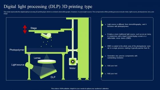 This slide represents the digital light processing 3D printing type which is similar to stereolithography. However, it used a light source. The components of this printing process include motor, light source, photopolymer, lens, and stage. Slidegeeks has constructed Digital Light Processing DLP 3D Printing Type Demonstration PDF after conducting extensive research and examination. These presentation templates are constantly being generated and modified based on user preferences and critiques from editors. Here, you will find the most attractive templates for a range of purposes while taking into account ratings and remarks from users regarding the content. This is an excellent jumping-off point to explore our content and will give new users an insight into our top-notch PowerPoint Templates. This slide represents the digital light processing 3D printing type which is similar to stereolithography. However, it used a light source. The components of this printing process include motor, light source, photopolymer, lens, and stage.