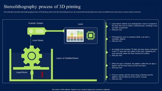 This slide talks about the stereolithography process of 3D printing, which is the first 3D printing process. Its components include liquid resin, layers of solidified resin, laser beam, scanner system, and laser. Welcome to our selection of the Iot Integration In Manufacturing Stereolithography Process Of 3D Printing Download PDF. These are designed to help you showcase your creativity and bring your sphere to life. Planning and Innovation are essential for any business that is just starting out. This collection contains the designs that you need for your everyday presentations. All of our PowerPoints are 100 percent editable, so you can customize them to suit your needs. This multi-purpose template can be used in various situations. Grab these presentation templates today
