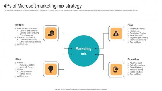 This slide shows marketing mix of Microsoft corporations. It includes four Ps product mix, price mix, promotion mix and place mix which contains information regarding products, pricing, distribution and promotions at Microsoft. Find a pre-designed and impeccable 4Ps Of Microsoft Marketing Mix Strategy Strategic Advancements By Microsofts Topics Pdf. The templates can ace your presentation without additional effort. You can download these easy-to-edit presentation templates to make your presentation stand out from others. So, what are you waiting for Download the template from Slidegeeks today and give a unique touch to your presentation. This slide shows marketing mix of Microsoft corporations. It includes four Ps product mix, price mix, promotion mix and place mix which contains information regarding products, pricing, distribution and promotions at Microsoft.