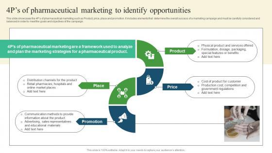 This slide showcases the 4Ps of pharmaceutical marketing such as Product, price, place and promotion. It includes elements that determine the overall success of a marketing campaign and must be carefully considered and balanced in order to meet the goals and objectives of the campaign. Boost your pitch with our creative 4Ps Of Pharmaceutical Marketing To Identify Accelerating Market Share And Profitability MKT SS V. Deliver an awe-inspiring pitch that will mesmerize everyone. Using these presentation templates you will surely catch everyones attention. You can browse the ppts collection on our website. We have researchers who are experts at creating the right content for the templates. So you do not have to invest time in any additional work. Just grab the template now and use them. This slide showcases the 4Ps of pharmaceutical marketing such as Product, price, place and promotion. It includes elements that determine the overall success of a marketing campaign and must be carefully considered and balanced in order to meet the goals and objectives of the campaign.