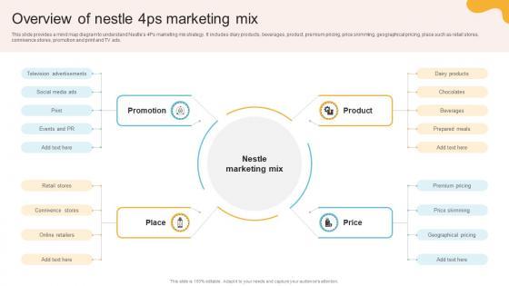 This slide provides a mind map diagram to understand Nestles 4Ps marketing mix strategy. It includes diary products, beverages, product, premium pricing, price skimming, geographical pricing, place such as retail stores, connivence stores, promotion and print and TV ads. Retrieve professionally designed Comprehensive Review Of Nestles Overview Of Nestle 4ps Marketing Mix Strategy SS V to effectively convey your message and captivate your listeners. Save time by selecting pre-made slideshows that are appropriate for various topics, from business to educational purposes. These themes come in many different styles, from creative to corporate, and all of them are easily adjustable and can be edited quickly. Access them as PowerPoint templates or as Google Slides themes. You do not have to go on a hunt for the perfect presentation because Slidegeeks got you covered from everywhere. This slide provides a mind map diagram to understand Nestles 4Ps marketing mix strategy. It includes diary products, beverages, product, premium pricing, price skimming, geographical pricing, place such as retail stores, connivence stores, promotion and print and TV ads.