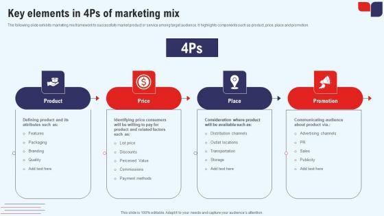 The following slide exhibits marketing mix framework to successfully market product or service among target audience. It highlights components such as product, price, place and promotion. Make sure to capture your audiences attention in your business displays with our gratis customizable Efficient Marketing Process For Business Key Elements In 4ps Of Marketing Mix Ideas Pdf. These are great for business strategies, office conferences, capital raising or task suggestions. If you desire to acquire more customers for your tech business and ensure they stay satisfied, create your own sales presentation with these plain slides. The following slide exhibits marketing mix framework to successfully market product or service among target audience. It highlights components such as product, price, place and promotion.