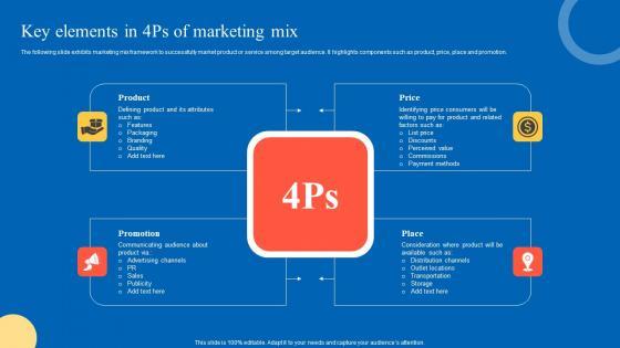 The following slide exhibits marketing mix framework to successfully market product or service among target audience. It highlights components such as product, price, place and promotion. Whether you have daily or monthly meetings, a brilliant presentation is necessary. Comprehensive Guide To Build Marketing Strategy Key Elements In 4Ps Of Marketing Mix Rules PDF can be your best option for delivering a presentation. Represent everything in detail using Comprehensive Guide To Build Marketing Strategy Key Elements In 4Ps Of Marketing Mix Rules PDF and make yourself stand out in meetings. The template is versatile and follows a structure that will cater to your requirements. All the templates prepared by Slidegeeks are easy to download and edit. Our research experts have taken care of the corporate themes as well. So, give it a try and see the results.
