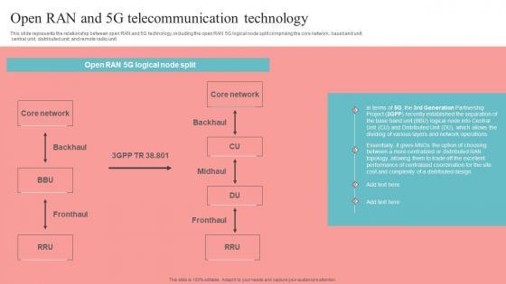 This slide represents the relationship between open RAN and 5G technology, including the open RAN 5G logical node split comprising the core network, baseband unit, central unit, distributed unit, and remote radio unit. If you are looking for a format to display your unique thoughts, then the professionally designed O RAN Architecture Open RAN And 5G Telecommunication Technology Microsoft PDF is the one for you. You can use it as a Google Slides template or a PowerPoint template. Incorporate impressive visuals, symbols, images, and other charts. Modify or reorganize the text boxes as you desire. Experiment with shade schemes and font pairings. Alter, share or cooperate with other people on your work. Download O RAN Architecture Open RAN And 5G Telecommunication Technology Microsoft PDF and find out how to give a successful presentation. Present a perfect display to your team and make your presentation unforgettable.