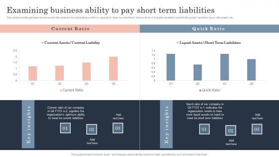 This slide provides glimpse about current ratio analysis for calculating our firms capacity to clear our short term debt on time. It includes quarterly current ratio graph, quarterly quick ratio graph, etc.Welcome to our selection of the Examining Business Ability To Pay Short Term Guide To Corporate Financial Growth Plan Mockup Pdf. These are designed to help you showcase your creativity and bring your sphere to life. Planning and Innovation are essential for any business that is just starting out. This collection contains the designs that you need for your everyday presentations. All of our PowerPoints are 100Precent editable, so you can customize them to suit your needs. This multi-purpose template can be used in various situations. Grab these presentation templates today. This slide provides glimpse about current ratio analysis for calculating our firms capacity to clear our short term debt on time. It includes quarterly current ratio graph, quarterly quick ratio graph, etc.