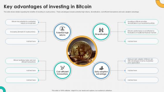 This slide shows details regrading the benefits of investing in cryptocurrency. These advantages includes potential high returns, diversification, cost efficient transactions and early adoption advantage. Do you have an important presentation coming up Are you looking for something that will make your presentation stand out from the rest Look no further than Key Advantages Of Investing In Everything About Bitcoin PPT Template Fin SS V. With our professional designs, you can trust that your presentation will pop and make delivering it a smooth process. And with Slidegeeks, you can trust that your presentation will be unique and memorable. So why wait Grab Key Advantages Of Investing In Everything About Bitcoin PPT Template Fin SS V today and make your presentation stand out from the rest This slide shows details regrading the benefits of investing in cryptocurrency. These advantages includes potential high returns, diversification, cost efficient transactions and early adoption advantage.