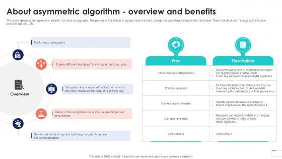 This slide represents the asymmetric algorithm for cloud cryptography. The purpose of this slide is to discuss about the basic concept and advantages of asymmetric technique. These include allows message authentication, practical approach, etc. Boost your pitch with our creative About Asymmetric Algorithm Overview Data Security In Cloud Computing Ppt Template. Deliver an awe-inspiring pitch that will mesmerize everyone. Using these presentation templates you will surely catch everyones attention. You can browse the ppts collection on our website. We have researchers who are experts at creating the right content for the templates. So you do not have to invest time in any additional work. Just grab the template now and use them. This slide represents the asymmetric algorithm for cloud cryptography. The purpose of this slide is to discuss about the basic concept and advantages of asymmetric technique. These include allows message authentication, practical approach, etc.