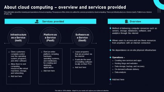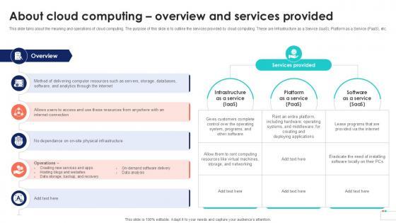 This slide talks about the meaning and operations of cloud computing. The purpose of this slide is to outline the services provided by cloud computing. These are Infrastructure as a Service IaaS, Platform as a Service PaaS, etc. Create an editable About Cloud Computing Overview And Services Data Security In Cloud Computing Ppt Template that communicates your idea and engages your audience. Whether you are presenting a business or an educational presentation, pre-designed presentation templates help save time. About Cloud Computing Overview And Services Data Security In Cloud Computing Ppt Template is highly customizable and very easy to edit, covering many different styles from creative to business presentations. Slidegeeks has creative team members who have crafted amazing templates. So, go and get them without any delay. This slide talks about the meaning and operations of cloud computing. The purpose of this slide is to outline the services provided by cloud computing. These are Infrastructure as a Service IaaS, Platform as a Service PaaS, etc.