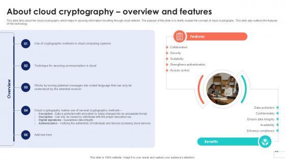 This slide talks about the cloud cryptography which helps in securing information travelling through cloud network. The purpose of this slide is to briefly explain the concept of cloud cryptography. This slide also outlines the features of this technology. Slidegeeks is one of the best resources for PowerPoint templates. You can download easily and regulate About Cloud Cryptography Overview And Features Data Security In Cloud Computing Ppt Powerpoint for your personal presentations from our wonderful collection. A few clicks is all it takes to discover and get the most relevant and appropriate templates. Use our Templates to add a unique zing and appeal to your presentation and meetings. All the slides are easy to edit and you can use them even for advertisement purposes. This slide talks about the cloud cryptography which helps in securing information travelling through cloud network. The purpose of this slide is to briefly explain the concept of cloud cryptography. This slide also outlines the features of this technology.