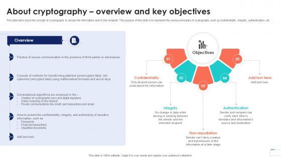This slide talks about the concept of cryptography to secure the information sent to the recipient. The purpose of this slide is to represent the various principles of cryptography such as confidentiality, integrity, authentication, etc. Want to ace your presentation in front of a live audience Our About Cryptography Overview And Key Data Security In Cloud Computing Ppt Example can help you do that by engaging all the users towards you. Slidegeeks experts have put their efforts and expertise into creating these impeccable powerpoint presentations so that you can communicate your ideas clearly. Moreover, all the templates are customizable, and easy-to-edit and downloadable. Use these for both personal and commercial use. This slide talks about the concept of cryptography to secure the information sent to the recipient. The purpose of this slide is to represent the various principles of cryptography such as confidentiality, integrity, authentication, etc.