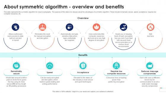 This slide represents the symmetric algorithm for cloud cryptography. The purpose of this slide is to discuss about the advantages of symmetric algorithm. These include remarkably secure, speed, acceptance, requires low computer resources, etc. From laying roadmaps to briefing everything in detail, our templates are perfect for you. You can set the stage with your presentation slides. All you have to do is download these easy-to-edit and customizable templates. About Symmetric Algorithm Overview Data Security In Cloud Computing Ppt Template will help you deliver an outstanding performance that everyone would remember and praise you for. Do download this presentation today. This slide represents the symmetric algorithm for cloud cryptography. The purpose of this slide is to discuss about the advantages of symmetric algorithm. These include remarkably secure, speed, acceptance, requires low computer resources, etc.