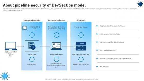 This slide discusses the pipeline security of DevSecOps. The purpose of this slide is to explain pipeline security and its importance in DevSecOps, which includes maximizing security personnel efficiency, automating non-intellectual tasks, improving the tracking of task statuses, and so on. This About Pipeline Security Of Devsecops Model Role Of Devsecops Ppt Powerpoint from Slidegeeks makes it easy to present information on your topic with precision. It provides customization options, so you can make changes to the colors, design, graphics, or any other component to create a unique layout. It is also available for immediate download, so you can begin using it right away. Slidegeeks has done good research to ensure that you have everything you need to make your presentation stand out. Make a name out there for a brilliant performance. This slide discusses the pipeline security of DevSecOps. The purpose of this slide is to explain pipeline security and its importance in DevSecOps, which includes maximizing security personnel efficiency, automating non-intellectual tasks, improving the tracking of task statuses, and so on.