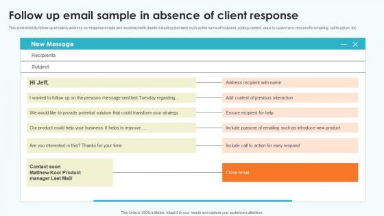This slide exhibits follow-up emails to address no-response emails and reconnect with clients including elements such as the name of recipient, adding context, value to customers, reasons for emailing, call to action, etc. Formulating a presentation can take up a lot of effort and time, so the content and message should always be the primary focus. The visuals of the PowerPoint can enhance the presenters message, so our Elevating Sales Networks Follow Up Email Sample In Absence Of Client Response SA SS V was created to help save time. Instead of worrying about the design, the presenter can concentrate on the message while our designers work on creating the ideal templates for whatever situation is needed. Slidegeeks has experts for everything from amazing designs to valuable content, we have put everything into Elevating Sales Networks Follow Up Email Sample In Absence Of Client Response SA SS V. This slide exhibits follow-up emails to address no-response emails and reconnect with clients including elements such as the name of recipient, adding context, value to customers, reasons for emailing, call to action, etc.