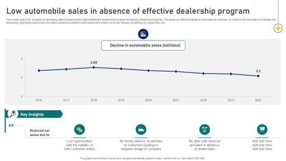 This slide covers key insights on declining sales of automobiles without effective dealership program for training dealers and agents. The purpose of this template is to provide an overview on reasons for low sales. It includes key takeaways depicting reasons for low sales based on inability to fulfil customers orders, no timely delivery of vehicles to customers, etc. Are you searching for a Guide To Building A Successful Low Automobile Sales In Absence Of Effective Dealership Strategy SS V that is uncluttered, straightforward, and original Its easy to edit, and you can change the colors to suit your personal or business branding. For a presentation that expresses how much effort you have put in, this template is ideal With all of its features, including tables, diagrams, statistics, and lists, its perfect for a business plan presentation. Make your ideas more appealing with these professional slides. Download Guide To Building A Successful Low Automobile Sales In Absence Of Effective Dealership Strategy SS V from Slidegeeks today. This slide covers key insights on declining sales of automobiles without effective dealership program for training dealers and agents. The purpose of this template is to provide an overview on reasons for low sales. It includes key takeaways depicting reasons for low sales based on inability to fulfil customers orders, no timely delivery of vehicles to customers, etc.